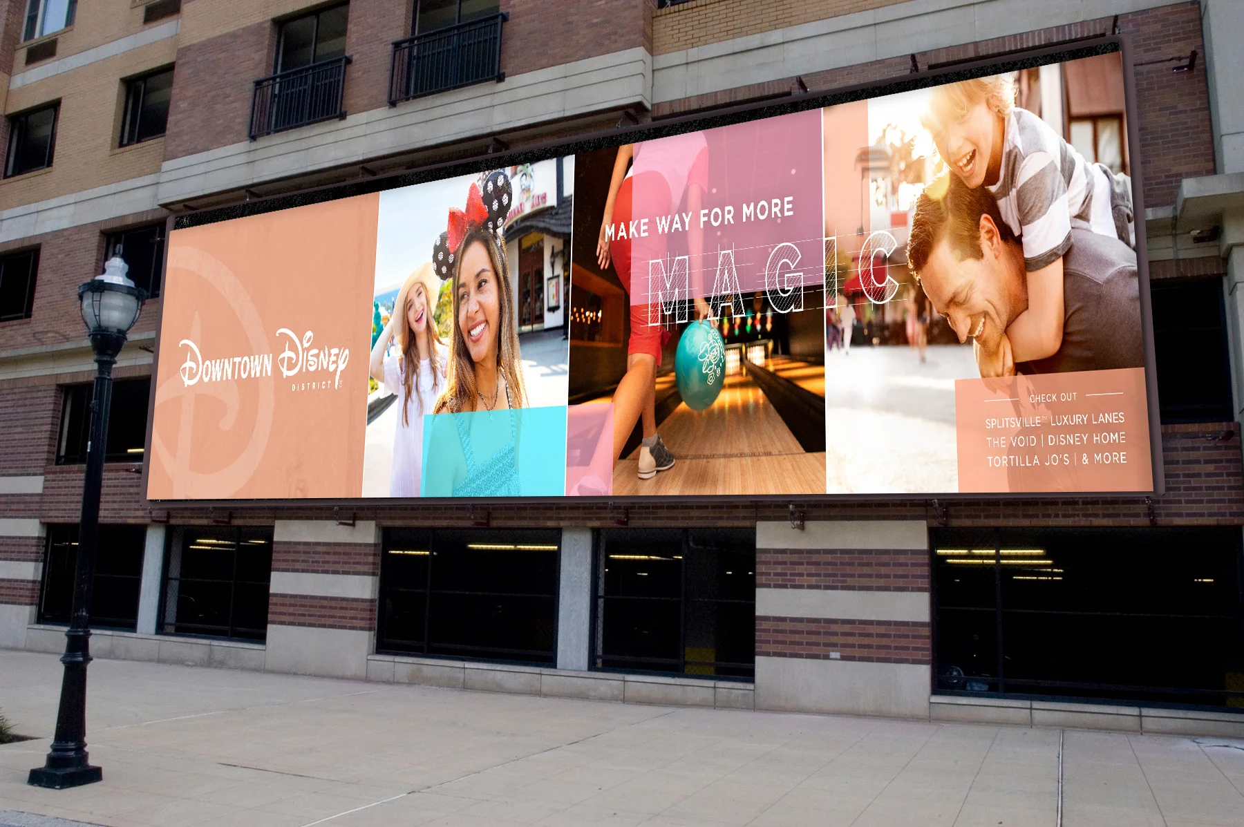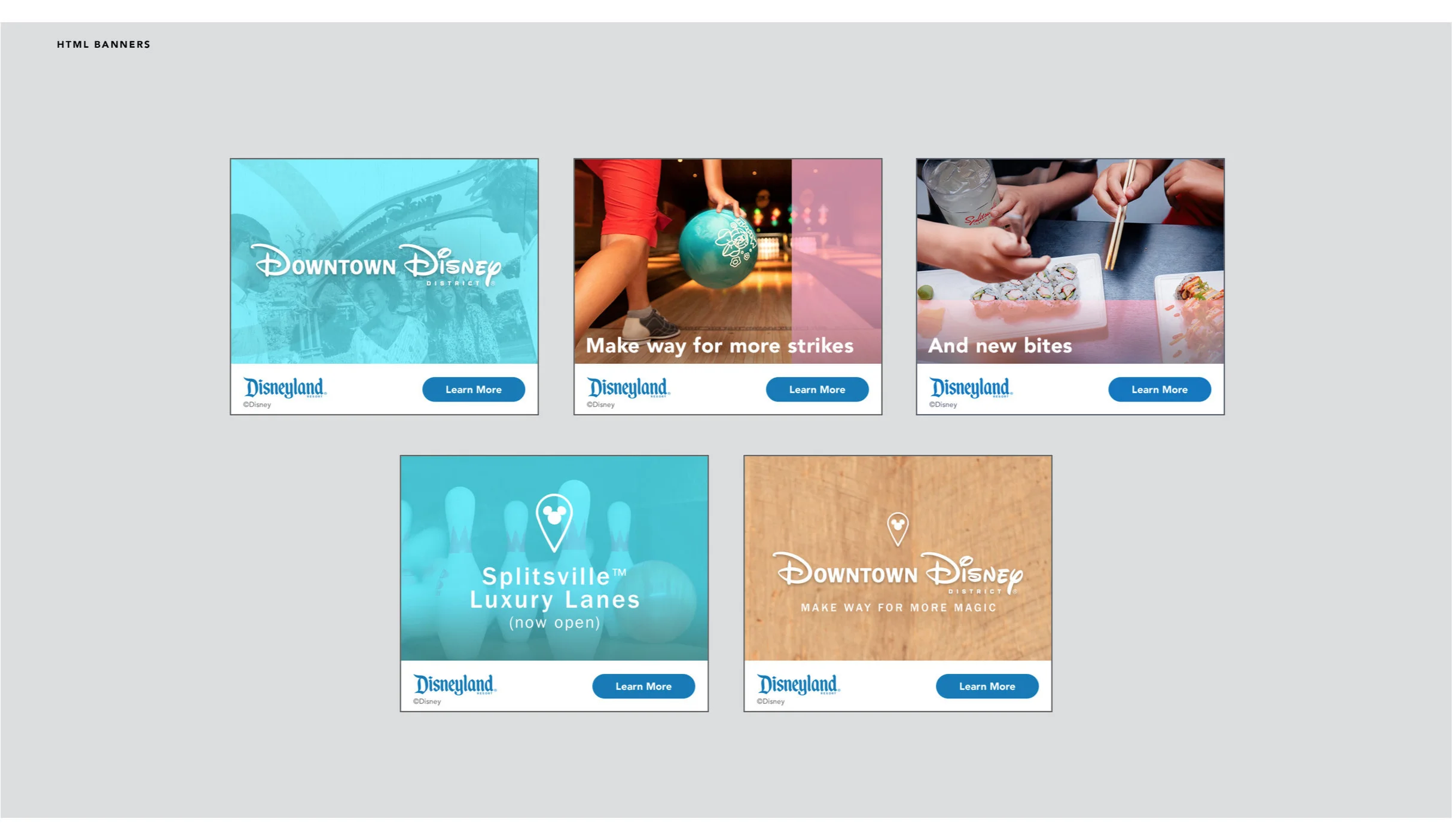 In addition, web banners, print ads, bus boards and social tactics were created. The look and feel for these pieces were inspired by the Downtown Disney refurbishment construction. The color-block elements and blue-print typography teased the magic in the works.